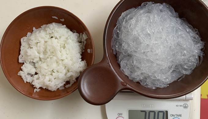 白米150gと緑豆春雨ゆで後200gを、いっしょに食べてみました。